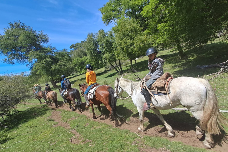Nos reuniremos en el retén de carabineros de San Fabián para ir juntos en vehículo hasta el sector el Caracol (30 minutos). Posterior a eso cruzaremos en carrito el río Ñuble, usando una técnica tradicional de cruce de ríos en la cordillera de los Andes. Al otro lado nos estarán esperando nuestros caballos. Después de las presentaciones y de la charla de inducción nos subiremos a nuestros caballos para empezar nuestra aventura, cabalgando por hermosos bosques nativos. Junto al sendero crecen especies arbóreas como el raulí (Nothofagus alpina), canelo (Drimys winteri), lleuque (Prumnopitys andina), mañío (Podocarpus salignus), coigüe (Nothofagus dombeyi), arrayán (Luma apiculata), avellano (Gevuina avellana), entre otras. En primavera y otoño, entrelazados en el follaje de los árboles, resaltan las flores rosadas de los copihues (Lapageria rosea). Quizás podremos escuchar el martilleo de pájaros carpinteros negros (Campephilus magellanicus) y el canto de chucaos (Scelorchilus rubecula). Haremos un primer descanso para soltar las piernas y tomar agua después de una hora y media de cabalgata. Luego seguiremos hasta llegar al mirador que nos sorprenderá por su belleza escénica. Antes de volver por otro camino, disfrutaremos del lugar para comer el picnic, descansar, y admirar el paisaje: el lago, los cerros Colorado y la Pila, y los patos que nadan en la laguna. Para los más aventureros, se podrá coordinar llevar packrafts (kayaks inflables) para bajar a navegar sobre la laguna.